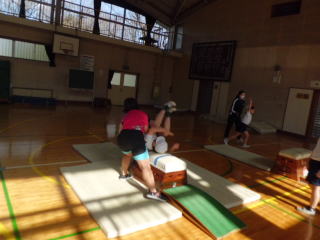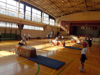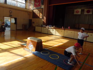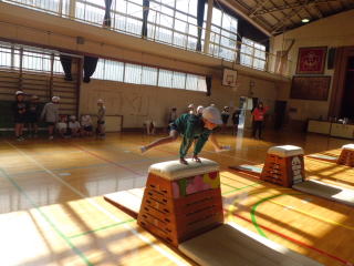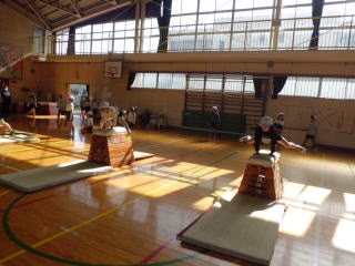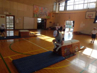 3年生は、開脚跳びや台上前転に取り組みました。