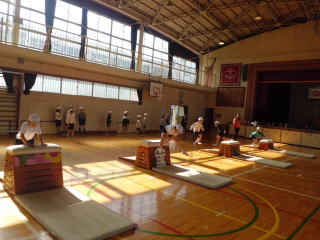 2,3年生が体育で跳び箱遊び、跳び箱運動を行いました。2年生は、開脚跳びにつながる様々な動きに取り組みました。