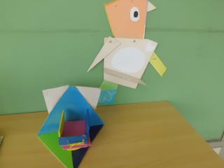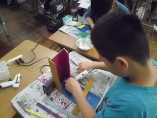 色塗りの終った子は、ホットボンドで接着して組み立てていました。