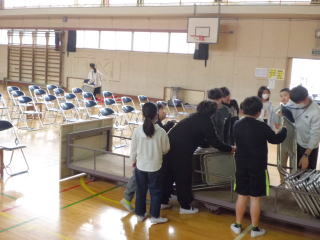 明日の卒業式に向けて、会場準備を行いました。3時間目には、5年生が頑張って椅子を並べました。