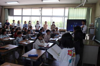 新しく赴任した先生の紹介の後、始業式を行いました。子供たちは校長の講話を集中して聞いていました。