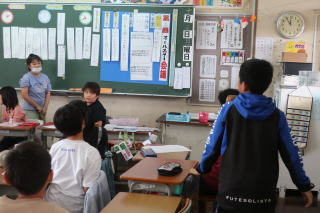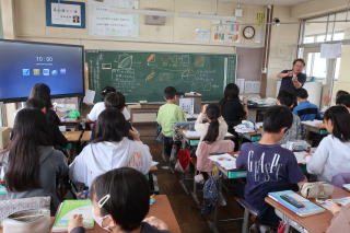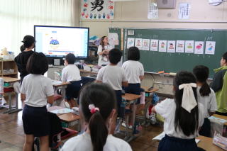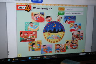 4年生が英語活動で時刻の表現について学習しました。まずチャンツに合わせて、ジェスチャーをつけながら表現を覚えました