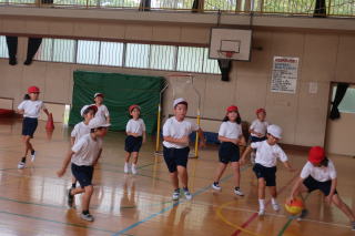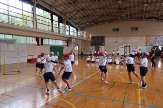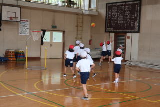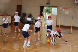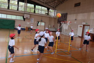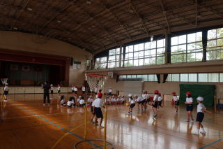 3年生が体育でセストボールをしました。バスケットボールに比べ、得点が入りやすいように低く大きいゴールを使っています。