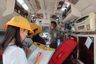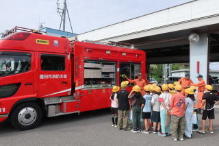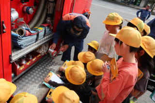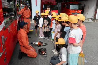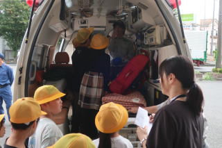 3年生が社会科の学習で消防署を見学しました。消防車や救急車の装備について、実物を見せながら詳しく教えていただきました。