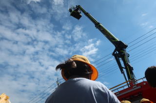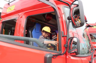 消防車の運転席に乗せていただいたり、高所作業車で放水する様子を見せていただいたりもしました。