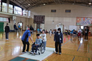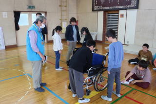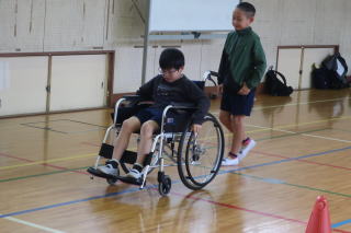 4年生が総合的な学習で車いす・視覚障がい者疑似体験を行いました。