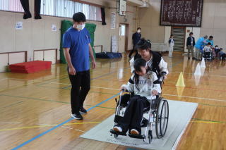 車いすの扱い方について説明をしていただいた後、障害物があるコースを順番に押したり自分でこいでみたりしました。