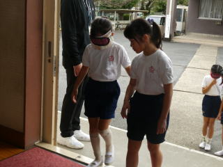 続いて、目の不自由な方の疑似体験としてアイマスクをして歩いたり、そうした方の歩行の補助をしてみたりしました。