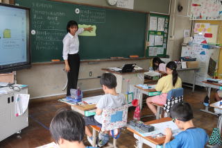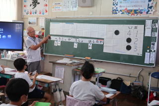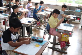 相変わらず暑い日が続きますが、子供たちの学習活動は順調に進んでいます。1年生は、校庭や体育館があまりに高温のため、冷房の効いた教室で体力づくりを行いました。
