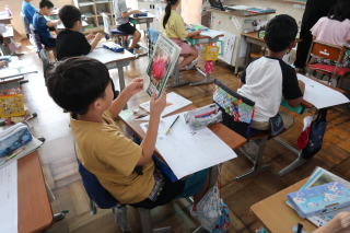 初めはおっかなびっくり描いている子が多かったのですが、作業が進むにつれ、だんだんと大胆になり、いろいろな技法を使う子も出てきました。